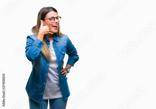 Young beautiful woman over wearing glasses over isolated background smiling doing phone gesture with hand and fingers like talking on the telephone. Communicating concepts.