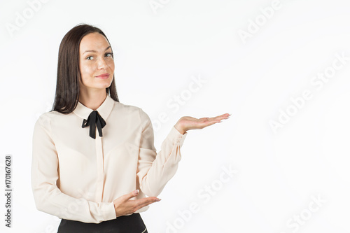 Young beautiful woman points to the object on the left / right. The girl smiles and points to the side. An attractive business lady is advertising something. Place for your text.