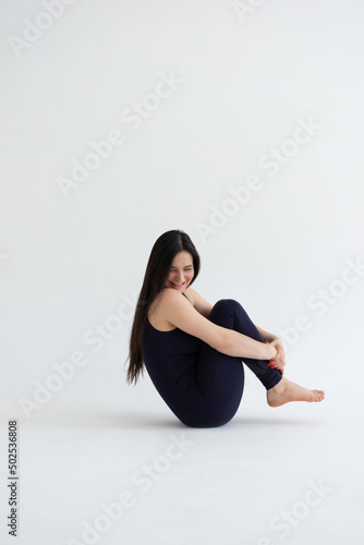 Young beautiful woman practicing yoga on a white background. Young beautiful girl doing exercises at home. Harmony, balance, meditation, relaxation, healthy lifestyle concept