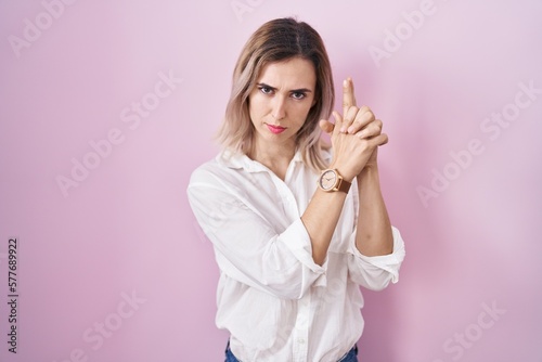 Young beautiful woman standing over pink background holding symbolic gun with hand gesture, playing killing shooting weapons, angry face
