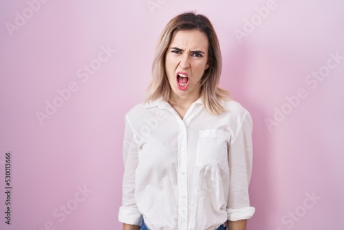Young beautiful woman standing over pink background in shock face, looking skeptical and sarcastic, surprised with open mouth