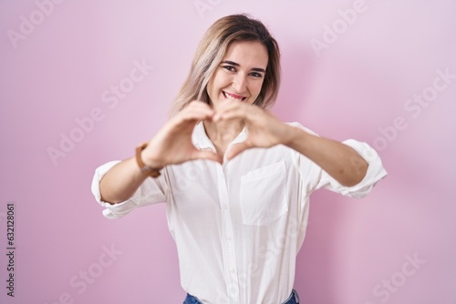 Young beautiful woman standing over pink background smiling in love doing heart symbol shape with hands. romantic concept.