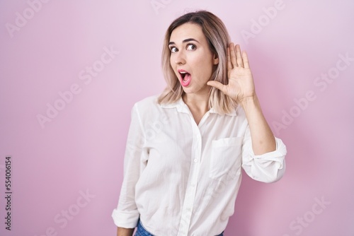 Young beautiful woman standing over pink background smiling with hand over ear listening an hearing to rumor or gossip. deafness concept.