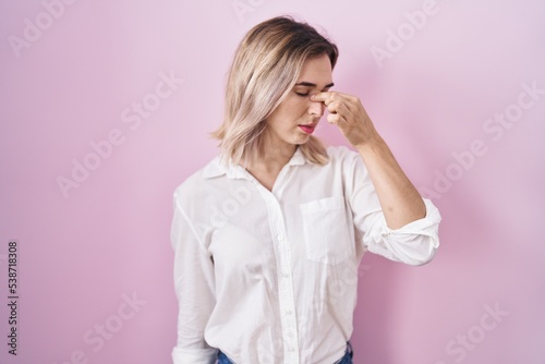 Young beautiful woman standing over pink background tired rubbing nose and eyes feeling fatigue and headache. stress and frustration concept.