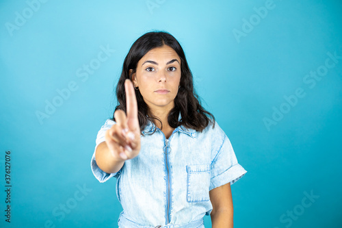 Young beautiful woman wearing a denim jumpsuit over isolated blue background showing and pointing up with fingers number one while is serious.