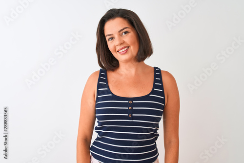 Young beautiful woman wearing blue striped t-shirt standing over isolated white background looking away to side with smile on face, natural expression. Laughing confident.