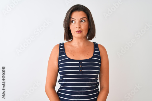 Young beautiful woman wearing blue striped t-shirt standing over isolated white background smiling looking to the side and staring away thinking.