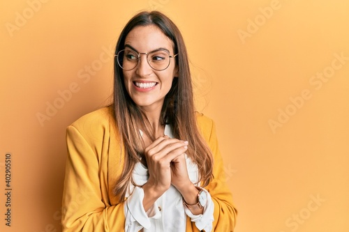 Young beautiful woman wearing business style and glasses laughing nervous and excited with hands on chin looking to the side
