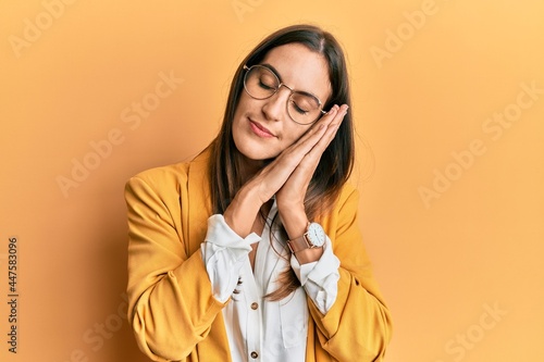 Young beautiful woman wearing business style and glasses sleeping tired dreaming and posing with hands together while smiling with closed eyes.