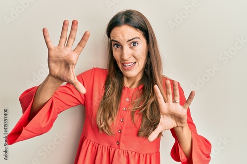 Young beautiful woman wearing casual clothes afraid and terrified with fear expression stop gesture with hands, shouting in shock. panic concept.