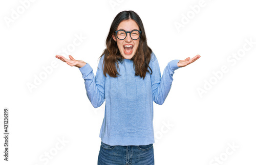 Young beautiful woman wearing casual clothes and glasses celebrating crazy and amazed for success with arms raised and open eyes screaming excited. winner concept