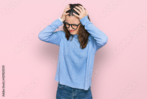 Young beautiful woman wearing casual clothes and glasses suffering from headache desperate and stressed because pain and migraine. hands on head.