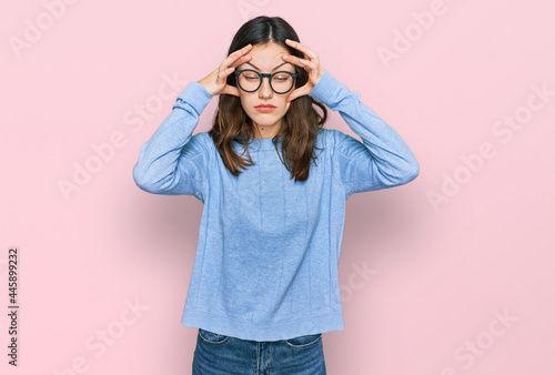 Young beautiful woman wearing casual clothes and glasses trying to open eyes with fingers, sleepy and tired for morning fatigue