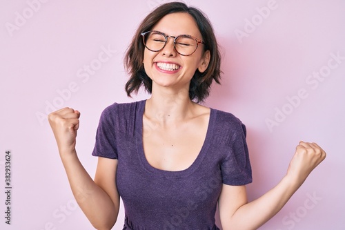 Young beautiful woman wearing casual clothes and glasses very happy and excited doing winner gesture with arms raised, smiling and screaming for success. celebration concept.