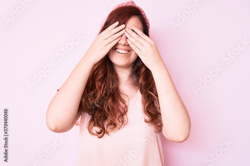 Young beautiful woman wearing casual clothes covering eyes with hands smiling cheerful and funny. blind concept.