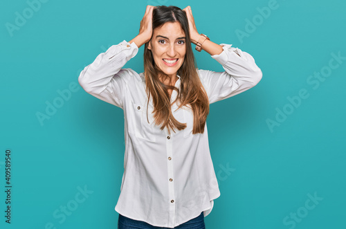 Young beautiful woman wearing casual clothes crazy and scared with hands on head, afraid and surprised of shock with open mouth