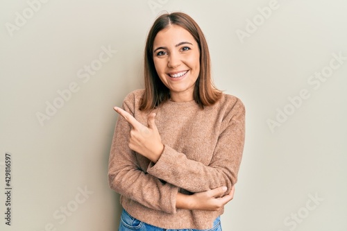 Young beautiful woman wearing casual clothes smiling cheerful pointing with hand and finger up to the side