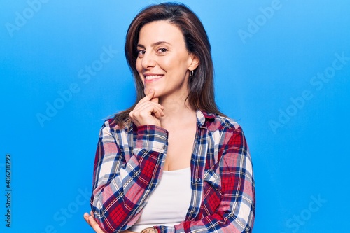 Young beautiful woman wearing casual clothes smiling looking confident at the camera with crossed arms and hand on chin. thinking positive.