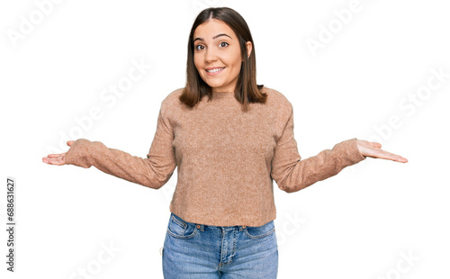 Young beautiful woman wearing casual clothes smiling showing both hands open palms, presenting and advertising comparison and balance