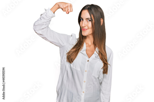 Young beautiful woman wearing casual clothes strong person showing arm muscle, confident and proud of power