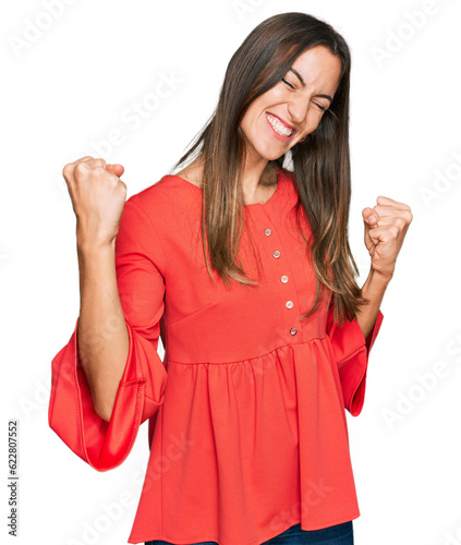 Young beautiful woman wearing casual clothes very happy and excited doing winner gesture with arms raised, smiling and screaming for success. celebration concept.