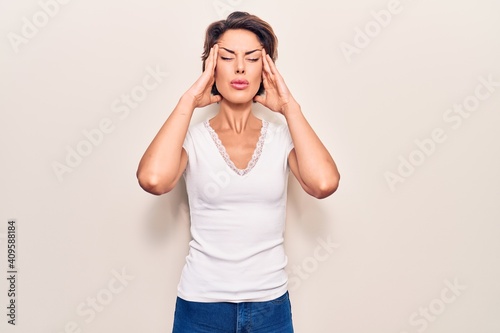 Young beautiful woman wearing casual clothes with hand on head for pain in head because stress. suffering migraine.