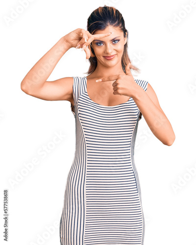 Young beautiful woman wearing casual dress smiling making frame with hands and fingers with happy face. creativity and photography concept.