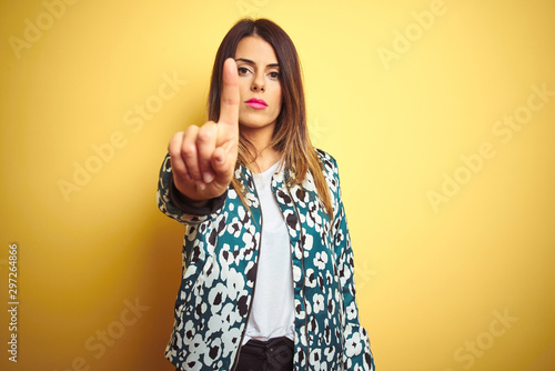 Young beautiful woman wearing casual jacket over yellow isolated background Pointing with finger up and angry expression, showing no gesture