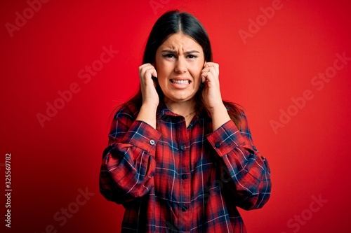Young beautiful woman wearing casual shirt over red background covering ears with fingers with annoyed expression for the noise of loud music. Deaf concept.