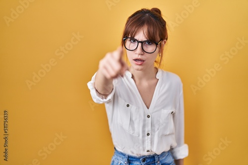 Young beautiful woman wearing casual shirt over yellow background pointing displeased and frustrated to the camera, angry and furious with you