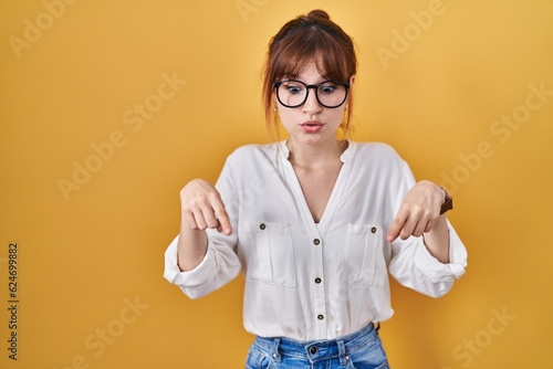 Young beautiful woman wearing casual shirt over yellow background pointing down with fingers showing advertisement, surprised face and open mouth