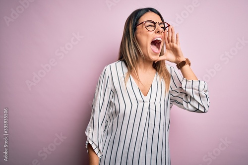 Young beautiful woman wearing casual striped t-shirt and glasses over pink background shouting and screaming loud to side with hand on mouth. Communication concept.