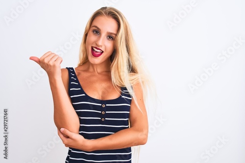 Young beautiful woman wearing casual striped t-shirt standing over isolated white background smiling with happy face looking and pointing to the side with thumb up.