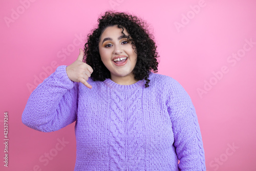Young beautiful woman wearing casual sweater over isolated pink background smiling doing phone gesture with hand and fingers like talking on the telephone