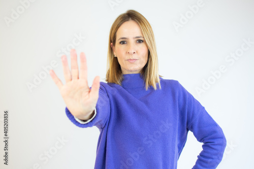 Young beautiful woman wearing casual sweater over white background doing stop sing with palm of the hand. Warning expression with negative and serious gesture on the face.