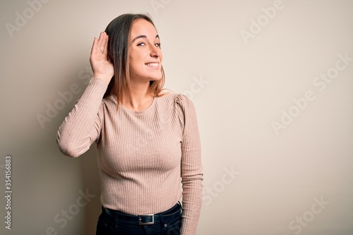 Young beautiful woman wearing casual sweater standing over isolated white background smiling with hand over ear listening an hearing to rumor or gossip. Deafness concept.