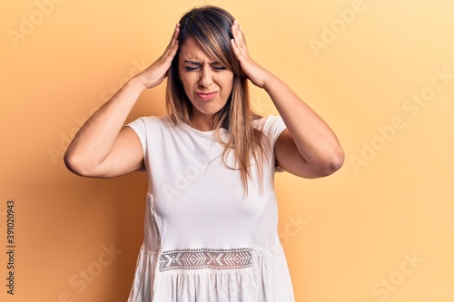 Young beautiful woman wearing casual t shirt with hand on head, headache because stress. suffering migraine.