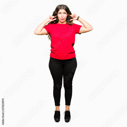 Young beautiful woman wearing casual t-shirt covering ears with fingers with annoyed expression for the noise of loud music. Deaf concept.