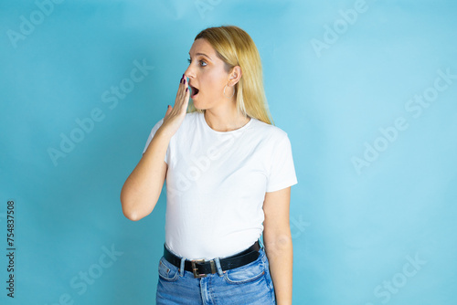 Young beautiful woman wearing casual t-shirt over isolated blue background covering mouth with hand, shocked and afraid for mistake. surprised expression