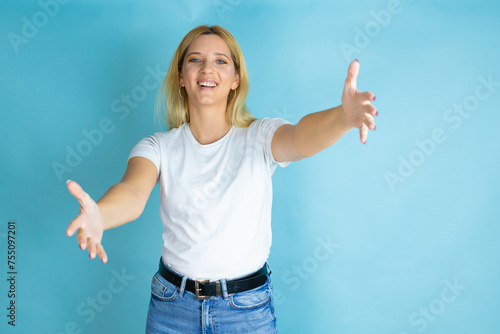 Young beautiful woman wearing casual t-shirt over isolated blue background looking at the camera smiling with open arms for hug