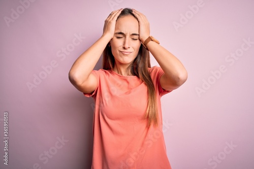 Young beautiful woman wearing casual t-shirt standing over isolated pink background suffering from headache desperate and stressed because pain and migraine. Hands on head.