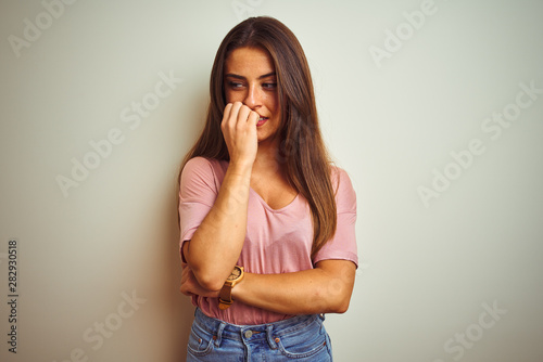 Young beautiful woman wearing casual t-shirt standing over isolated white background looking stressed and nervous with hands on mouth biting nails. Anxiety problem.