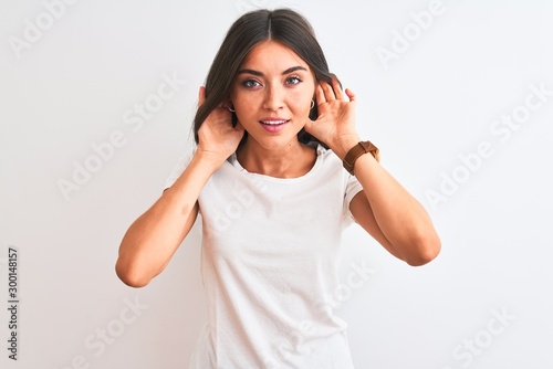 Young beautiful woman wearing casual t-shirt standing over isolated white background Trying to hear both hands on ear gesture, curious for gossip. Hearing problem, deaf