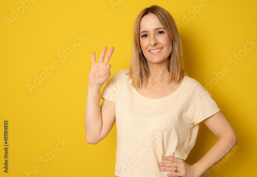 Young beautiful woman wearing casual t-shirt standing over yellow isolated background smiling positive doing ok sign with hand and fingers. Successful expression.