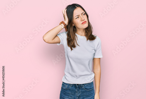 Young beautiful woman wearing casual white t shirt confuse and wondering about question. uncertain with doubt, thinking with hand on head. pensive concept.