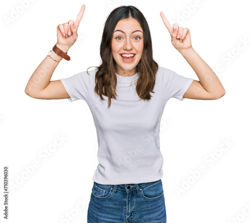 Young beautiful woman wearing casual white t shirt smiling amazed and surprised and pointing up with fingers and raised arms.