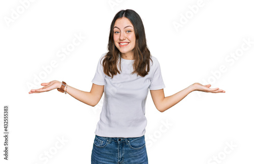 Young beautiful woman wearing casual white t shirt smiling showing both hands open palms, presenting and advertising comparison and balance