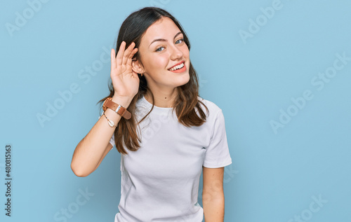 Young beautiful woman wearing casual white t shirt smiling with hand over ear listening an hearing to rumor or gossip. deafness concept.