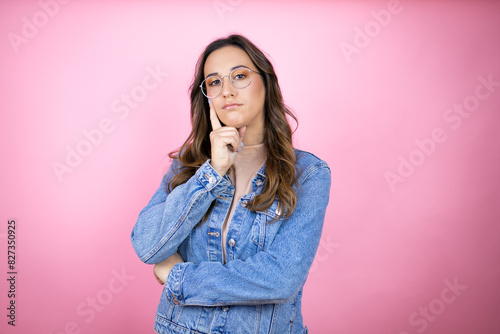 Young beautiful woman wearing denim jacket over isolated pink background happy face thinking about question with hand on chin, thoughtful about confusing idea