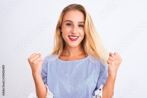 Young beautiful woman wearing elegant blue t-shirt standing over isolated white background celebrating surprised and amazed for success with arms raised and open eyes. Winner concept.